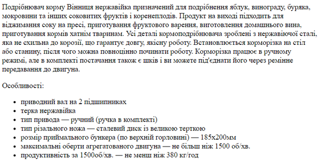 Кормоподрібнювач з ручним приводом вагою 10 кг допоможе вам ефективно переробляти таку сировину, як яблука, буряк, морква, виноград, коренеплоди і не тільки. Після поміщення його в приймальний бункер об'ємом 6 літрів свою роботу починає ріжучий ніж, що представляє собою сталевий диск з великою терткою. При цьому вихідний продукт придатний для різних цілей; насамперед це приготування кормових сумішей для сільськогосподарських тварин та птиці, але також виготовлення домашніх вин, приготування варення, віджимання соку за допомогою преса та ін.